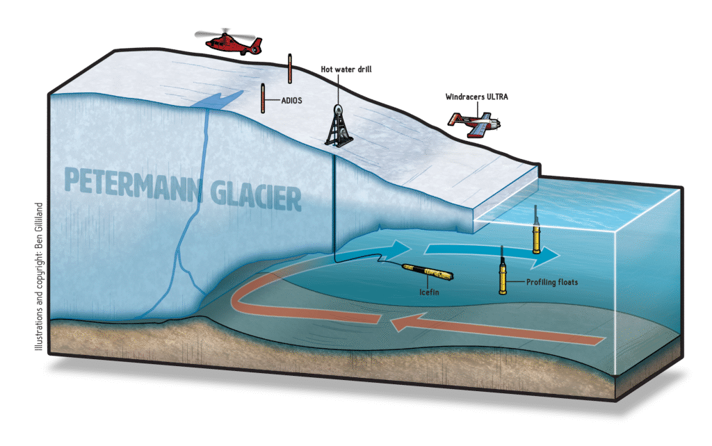 The RRS Sir David Attenborough In 2027, the focus will move north to Petermann Glacier, where the underwater vehicle Icefin will be lowered through a drilled access hole beneath the glacier’s floating tongue to study melting at the grounding line — the zone where ice begins to float.