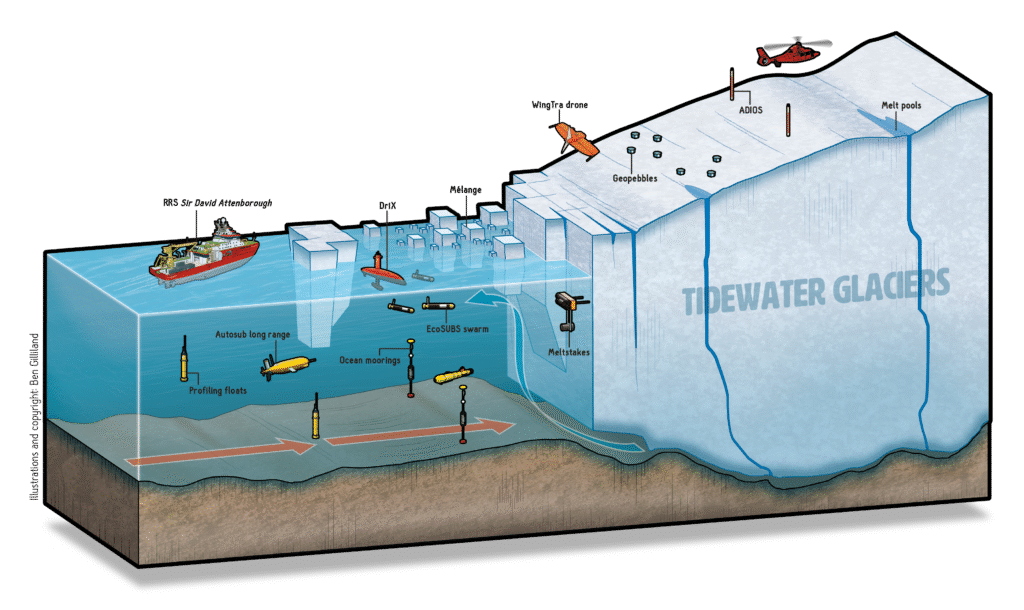 GIANT’s hugely ambitious fieldwork campaigns will deploy an arsenal of monitoring equipments with a short time period to understand two major glaciers. Both expeditions will use uncrewed aerial and underwater vehicles for precision mapping, drone scanning and seismic sensors to monitor ice cracking and calving, and profiling floats and satellites to measure ocean conditions year-round.